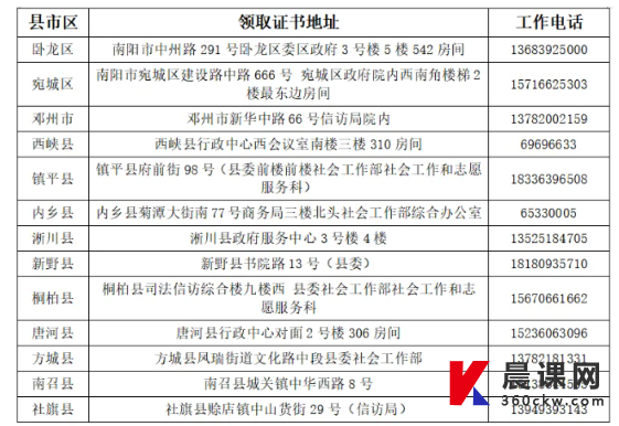 居住地在官庄工区、职教园区、城乡一体化示范区、高新区的考生证书由南阳市委社会工作部代发。(领取地址:南阳市市民服务中心北区1号楼1楼市委社会工作部136室、联系电话:0377-63392627)