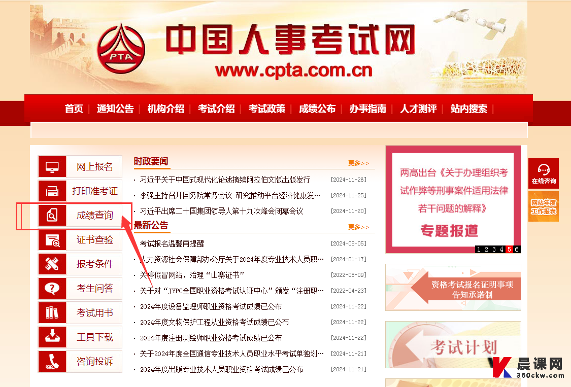 第一步:进入中国人事考试网,点击左侧成绩查询栏目,进入成绩查询页面。